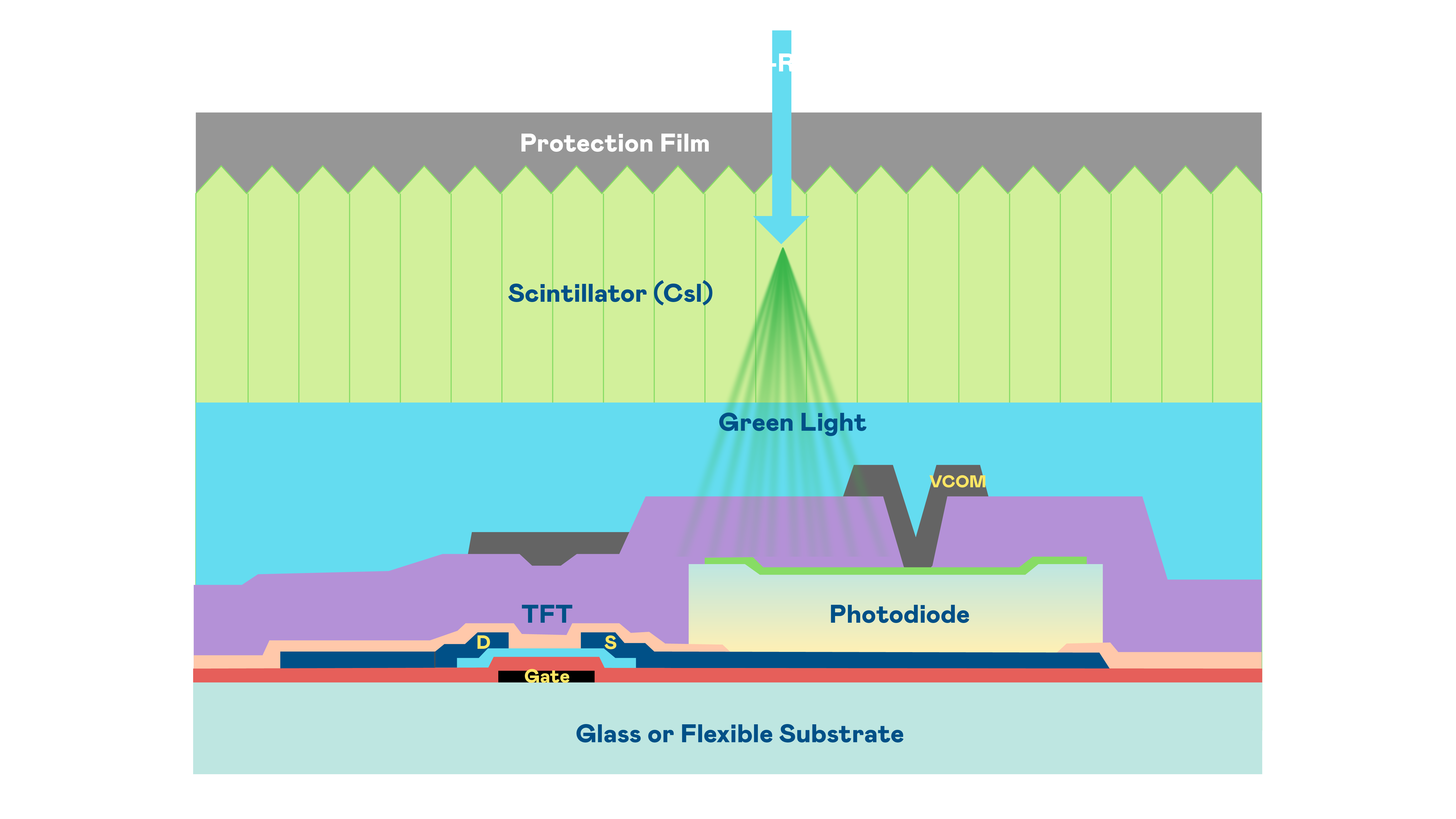 完美真人WM的X光影像感测阵列使用薄膜电晶体 (TFT) 作为每个像素的读取开关,搭配光电二极体(Photodiode)的光电转换元件,用以感测X光影像讯号。
